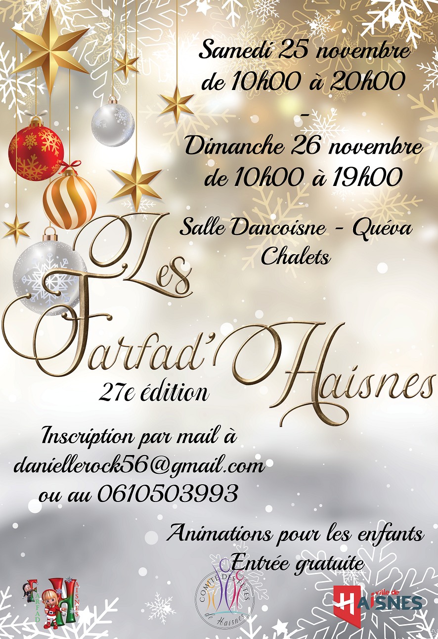 Salle O. DANCOISNE – Rue Roger Salengro – 62138 HAISNES Rue Roger Salengro, HAISNES, FranceLes Farfad'Haisnes - les 25 et 26 novembre prochain 90 exposants ! Gastronomie, Artisanat, manèges pour enfants, Séance photo avec le Père Noël ! Le programme des mascottes : * le samedi : Mickey, mini Stitch, Tigrou, Olaf * le dimanche : la Pat ’Patrouille toute la journée Réservez votre week-end ! Restauration sur place, […]