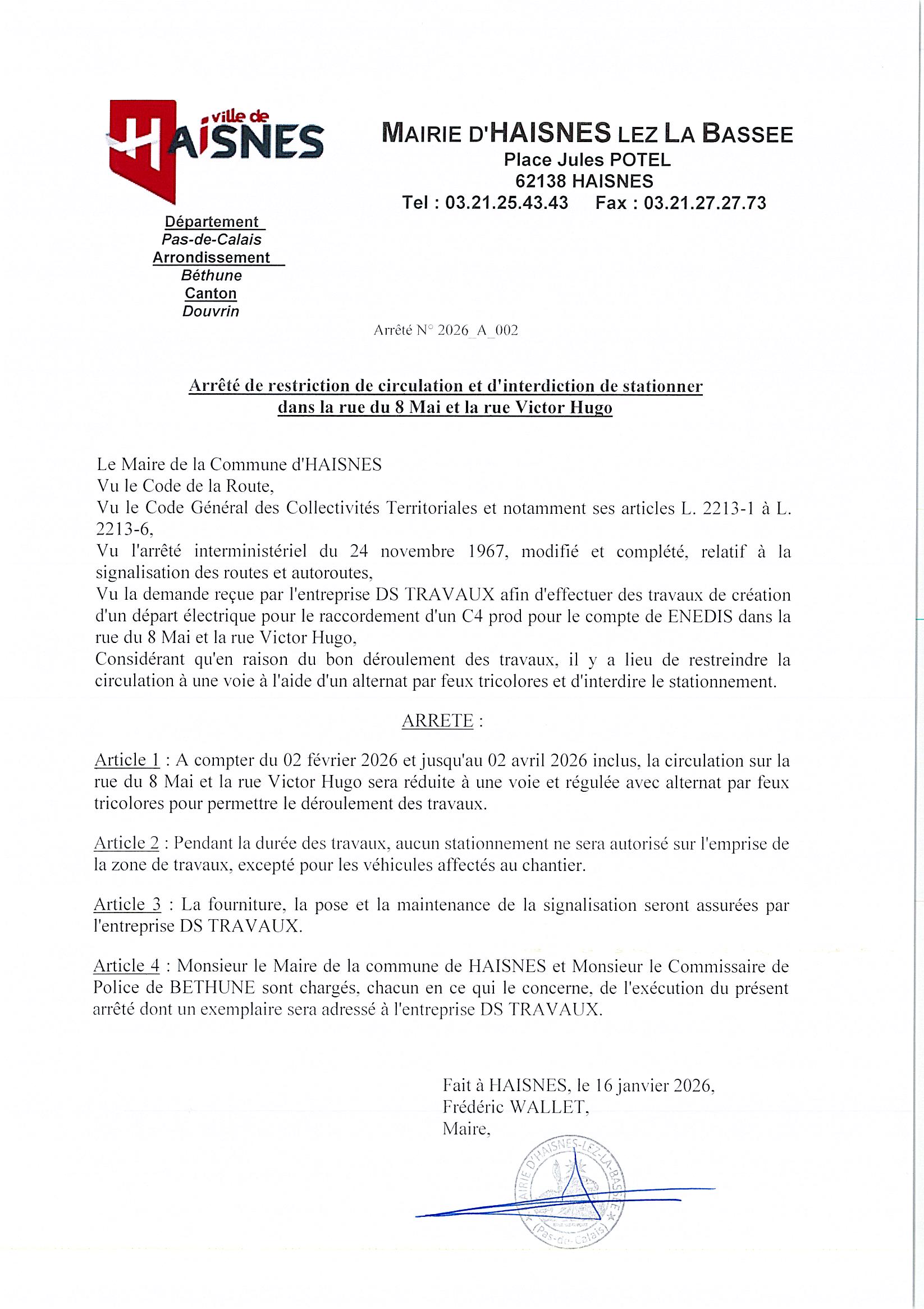 𝐀 𝐜𝐨𝐦𝐩𝐭𝐞𝐫 𝐝𝐮 𝟎𝟐 𝐟𝐞́𝐯𝐫𝐢𝐞𝐫 𝟐𝟎𝟐𝟔 𝐞𝐭 𝐣𝐮𝐬𝐪𝐮’𝐚𝐮 𝟎𝟐 𝐚𝐯𝐫𝐢𝐥 𝟐𝟎𝟐𝟔 𝐢𝐧𝐜𝐥𝐮𝐬, la circulation sur la rue du 8 Mai et la rue Victor Hugo sera réduite à une voie et régulée avec alternat par feux tricolores pour permettre le déroulement des travaux.