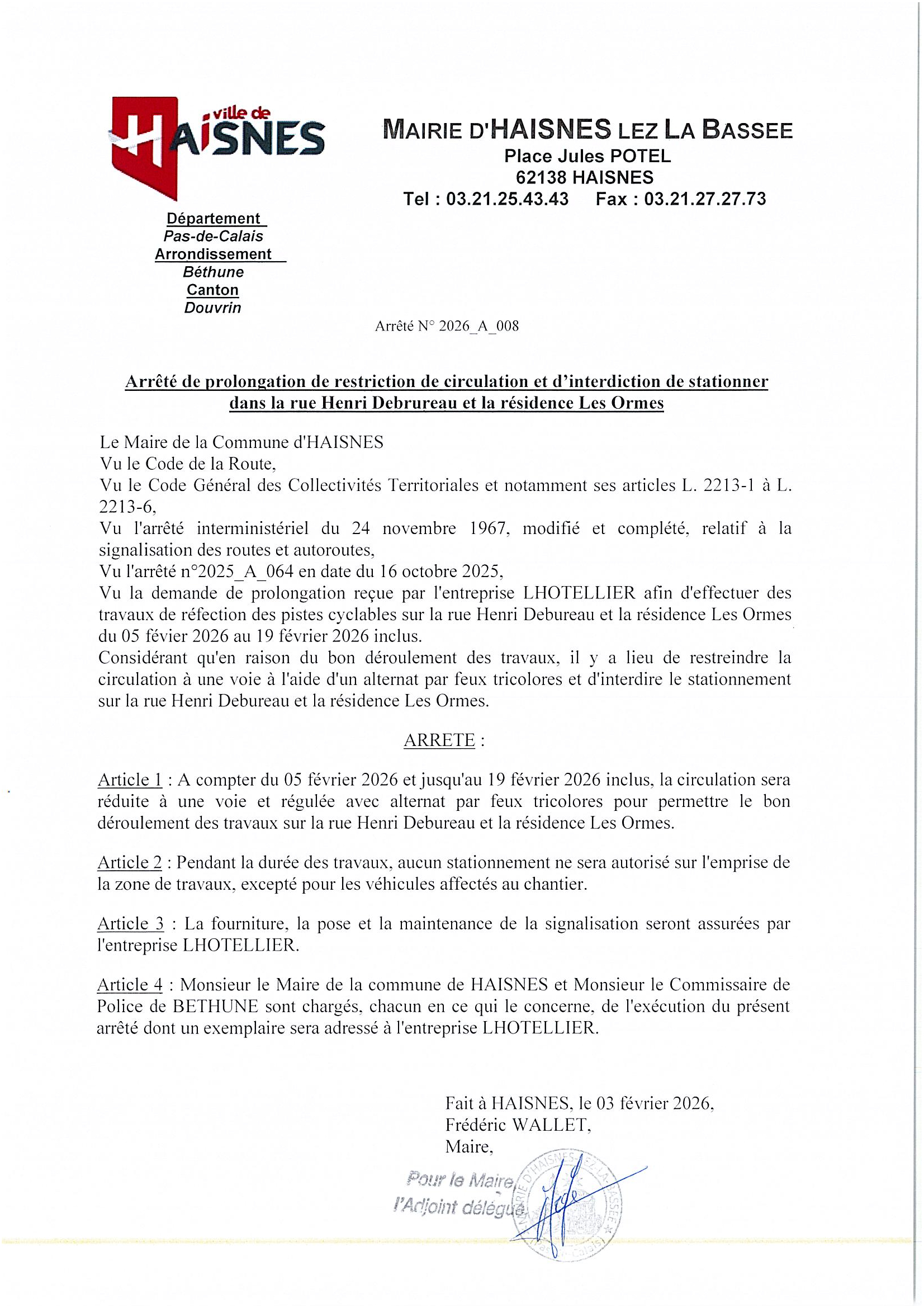 Arrêté de prolongation de restriction de circulation et d’interdiction de stationner dans la rue Henri Debureau et la résidence Les Ormes