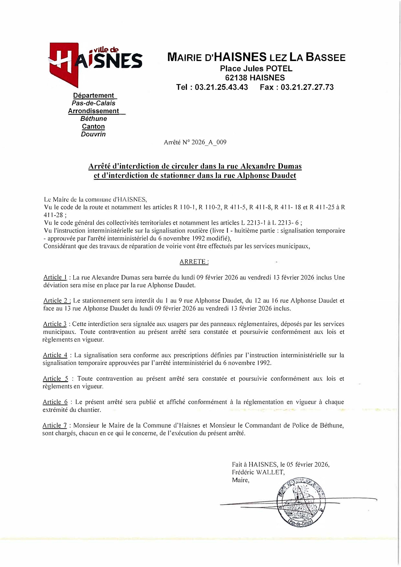 Arrêté d’interdiction de circuler dans la rue Alexandre Dumaset d’interdiction de stationner dans la rue Alphonse Daudet