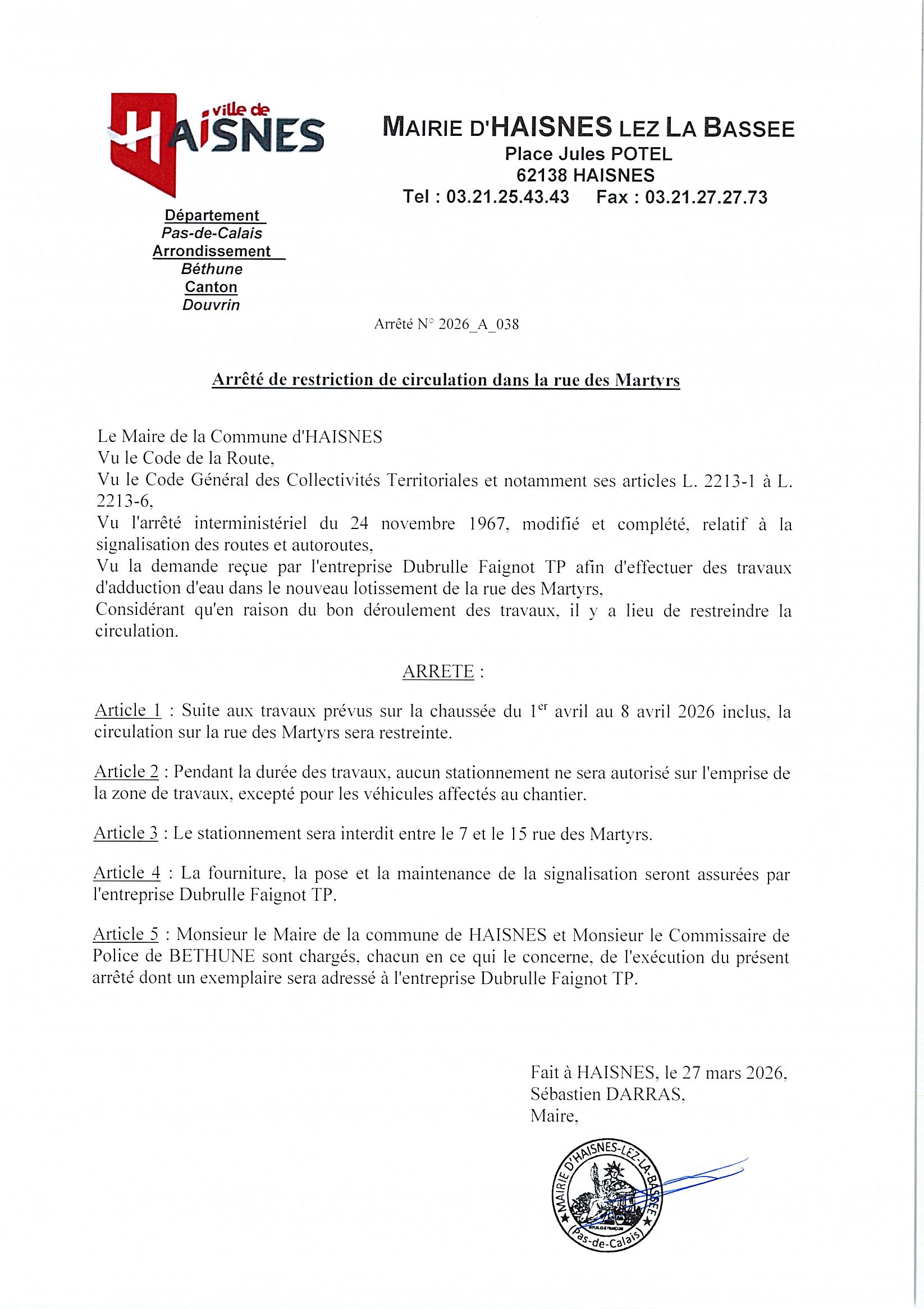 Arrêté de restriction de circulation dans la rue des Martyrs