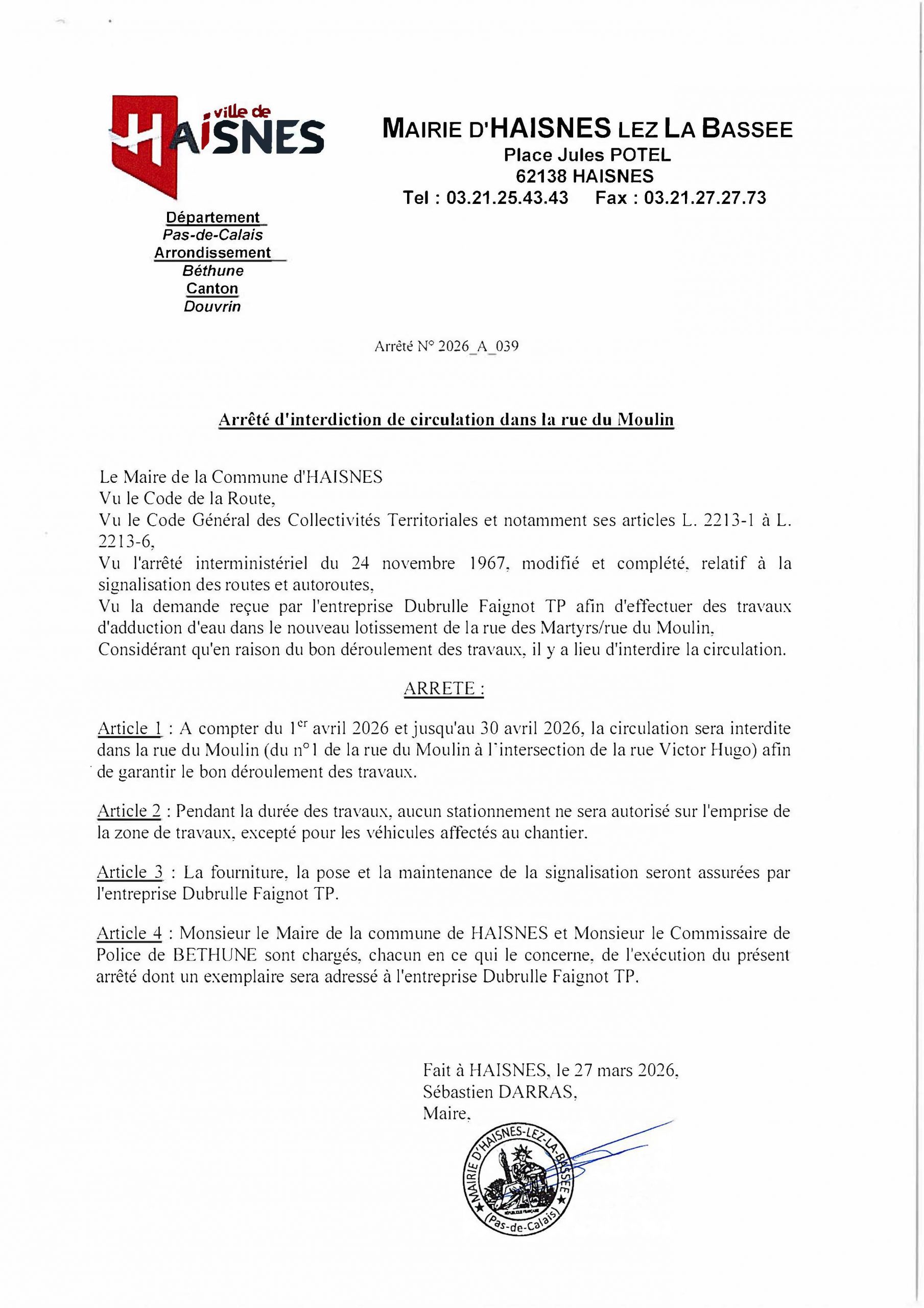 A compter du 1er avril 2026 et jusqu’au 30 avril 2026, la circulation sera interdite dans la rue du Moulin (du n° 1 de la rue du Moulin à l’intersection de la rue Victor Hugo) afin de garantir le bon déroulement des travaux.