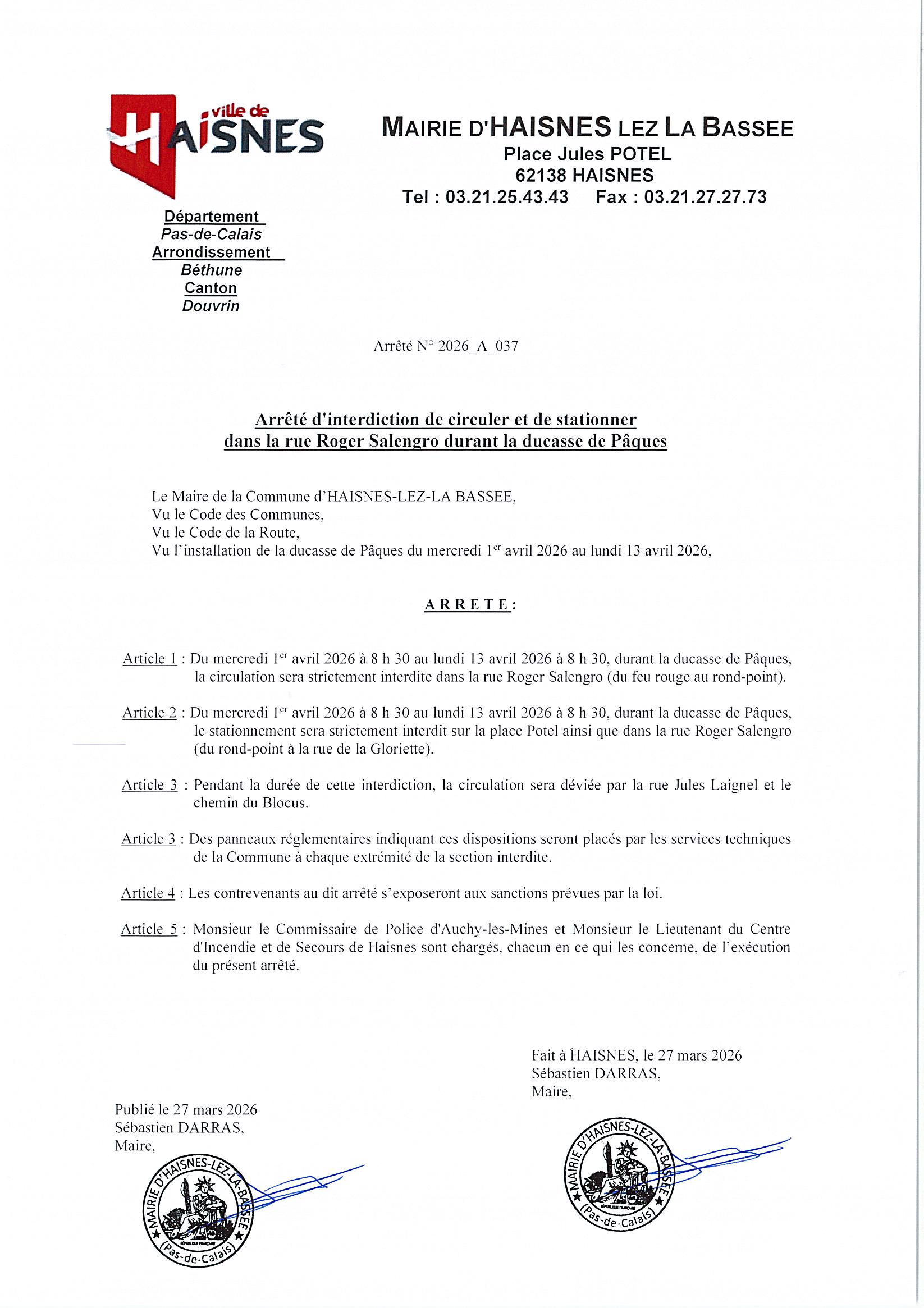 Arrêté d’interdiction de circuler et de stationner dans la rue Roger Salengro durant la ducasse de Pâques